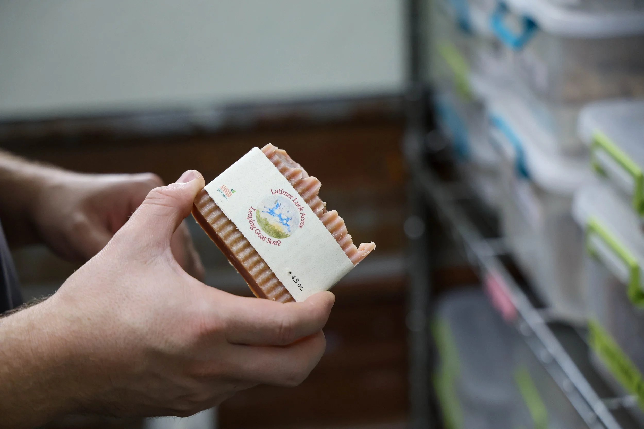 Matthew Terry, manager of Leaping Goat Soap, 32, from Thetford, England, holds up a bar soap at Latimer Luck Acres in Watkinsville, Georgia, on Saturday, May 25, 2024. Bars are sold at the Community, Farm 441, Nancy's Candy and Spice and The Mason Jar Shoppe.