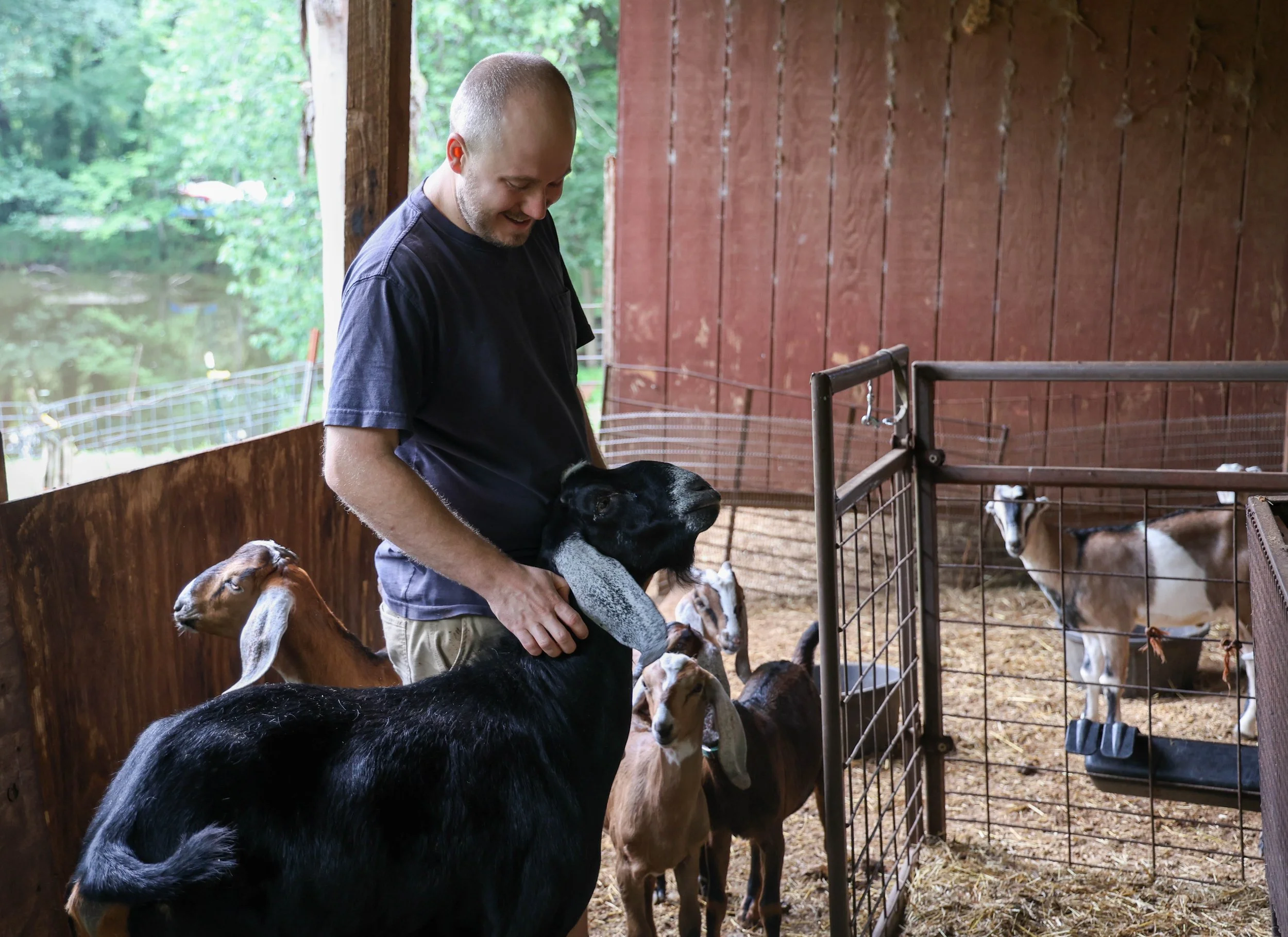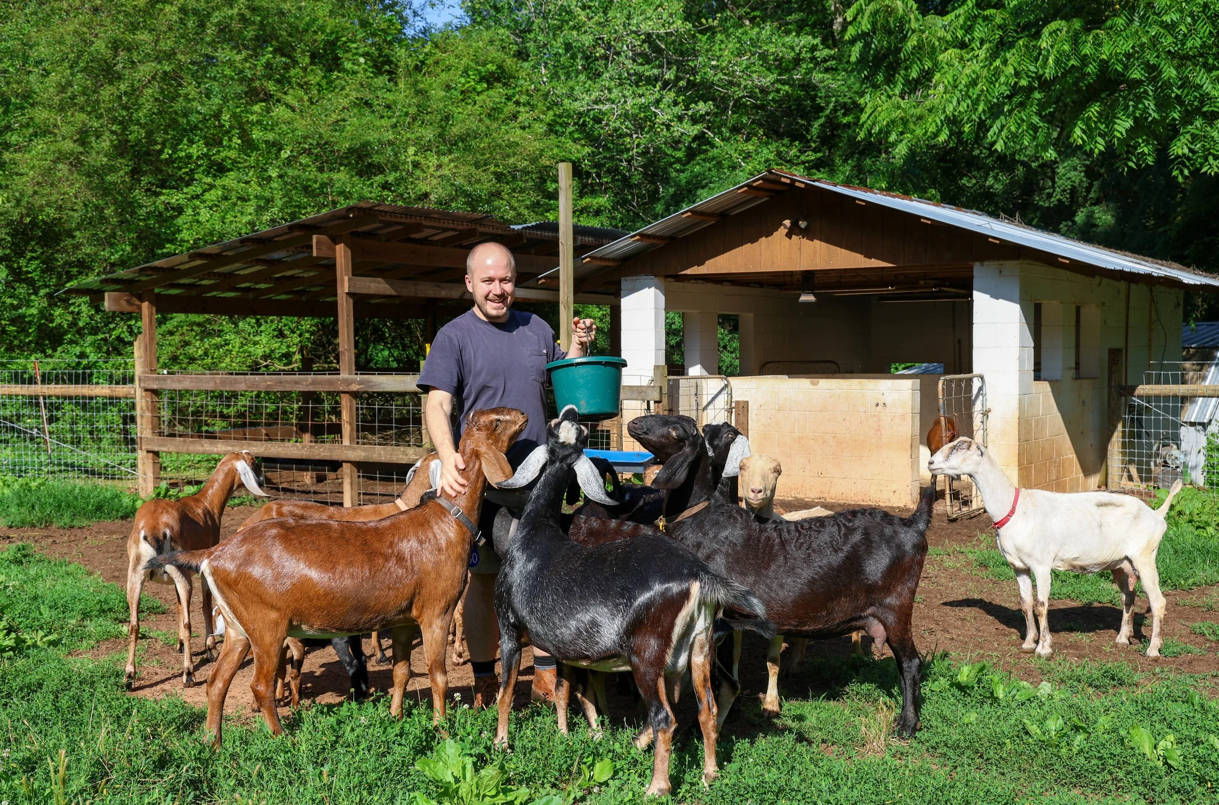 Matthew Terry, manager of Leaping Goat Soap, 32, from Thetford, England, poses for a portrait with his goats at Latimer Luck Acres in Watkinsville, Georgia, on Tuesday, May 28, 2024. Leaping Goat Soap has been going for 11 years, and he would help the farm when visiting until he moved to Georgia 11 months ago.