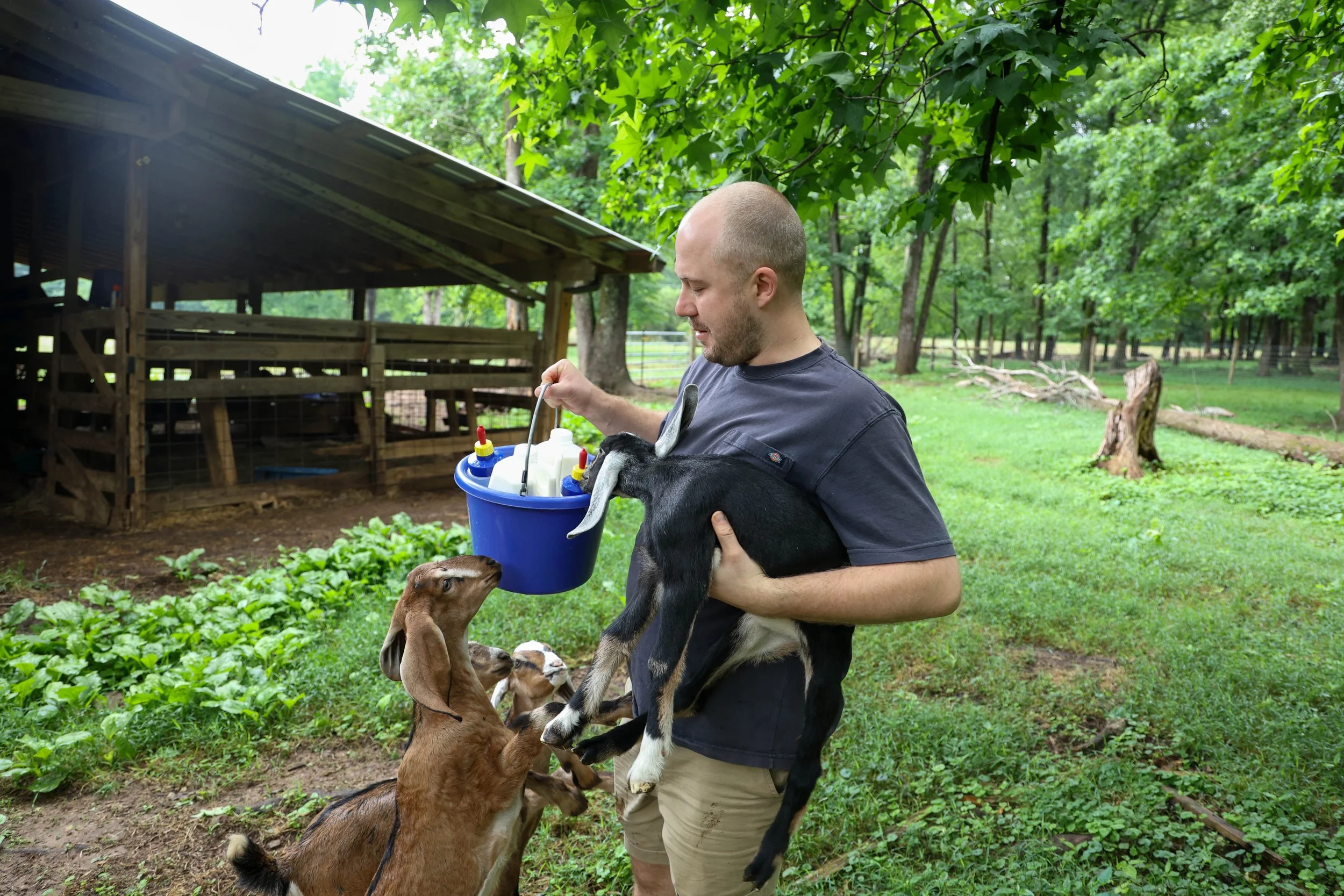 Matthew Terry, manager of Leaping Goat Soap, 32, from Thetford, England, walks to the other barn to feed the baby goats at Latimer Luck Acres in Watkinsville, Georgia, on Saturday, May 25, 2024. Terry said he loves working with the goats because they have so much personality, and it's like having a herd of dogs.