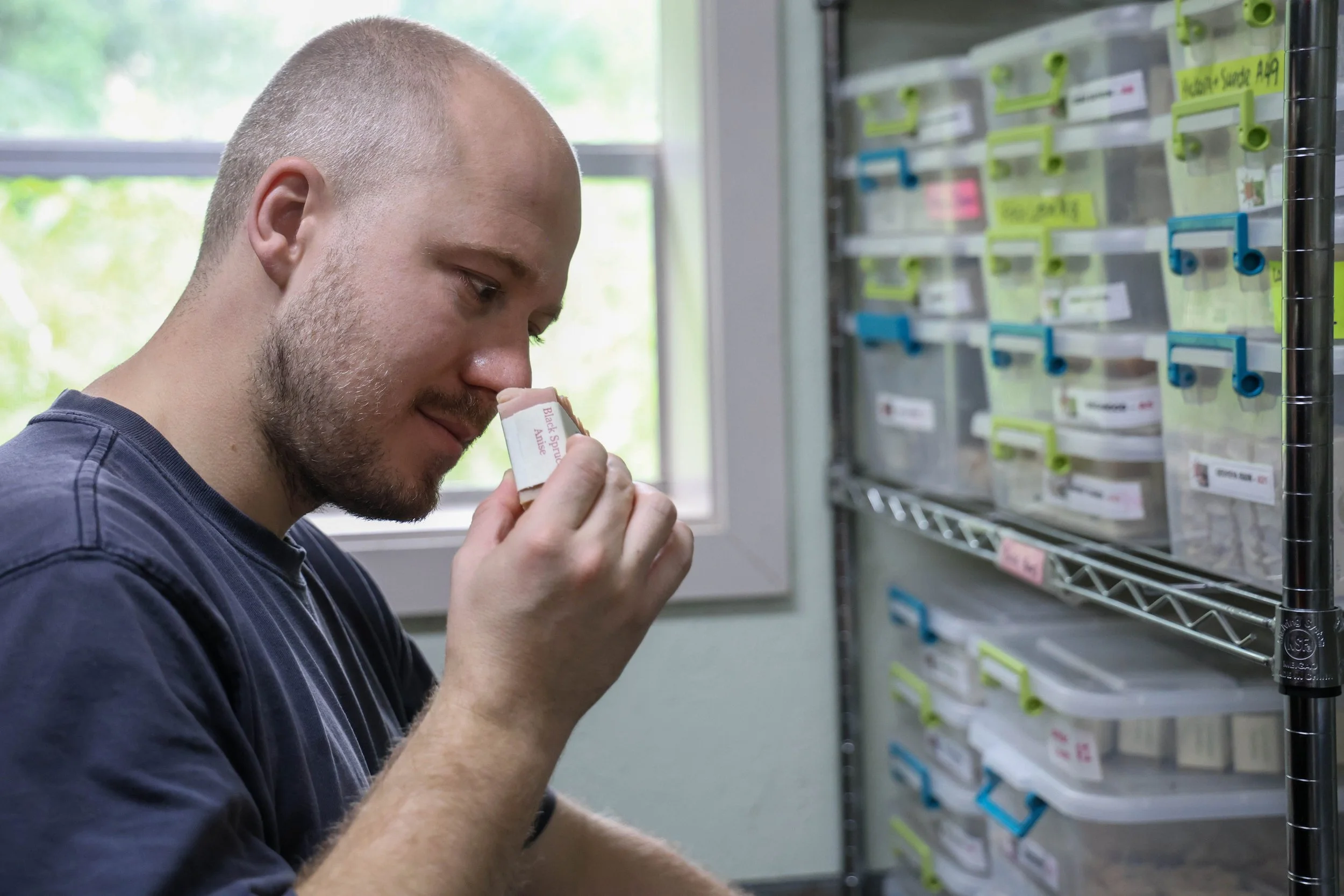 Matthew Terry, manager of Leaping Goat Soap, 32, from Thetford, England, smells the bar of soap at Latimer Luck Acres in Watkinsville, Georgia, on Saturday, May 25, 2024. The farm sells soap at the Athens Farmers Market on the third Saturday of every month, the Oconee Farmers Market and the Winterville Marigold Farmers Market.
