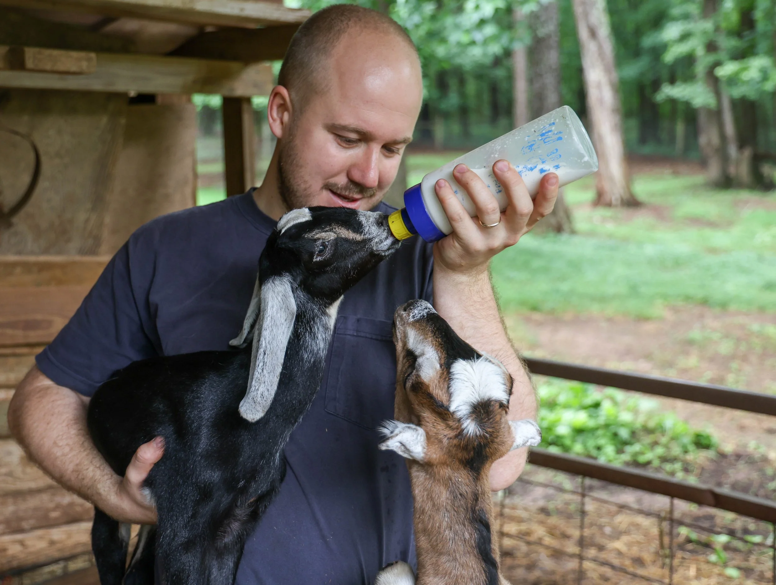 Matthew Terry, manager of Leaping Goat Soap, 32, from Thetford, England, feeds his baby goat, Ginseng, and his other goat, Parsley, reaches for the milk at Latimer Luck Acres in Watkinsville, Georgia, on Saturday, May 25, 2024. Terry said he loves working with the goats because they have so much personality, and it's like having a herd of dogs.