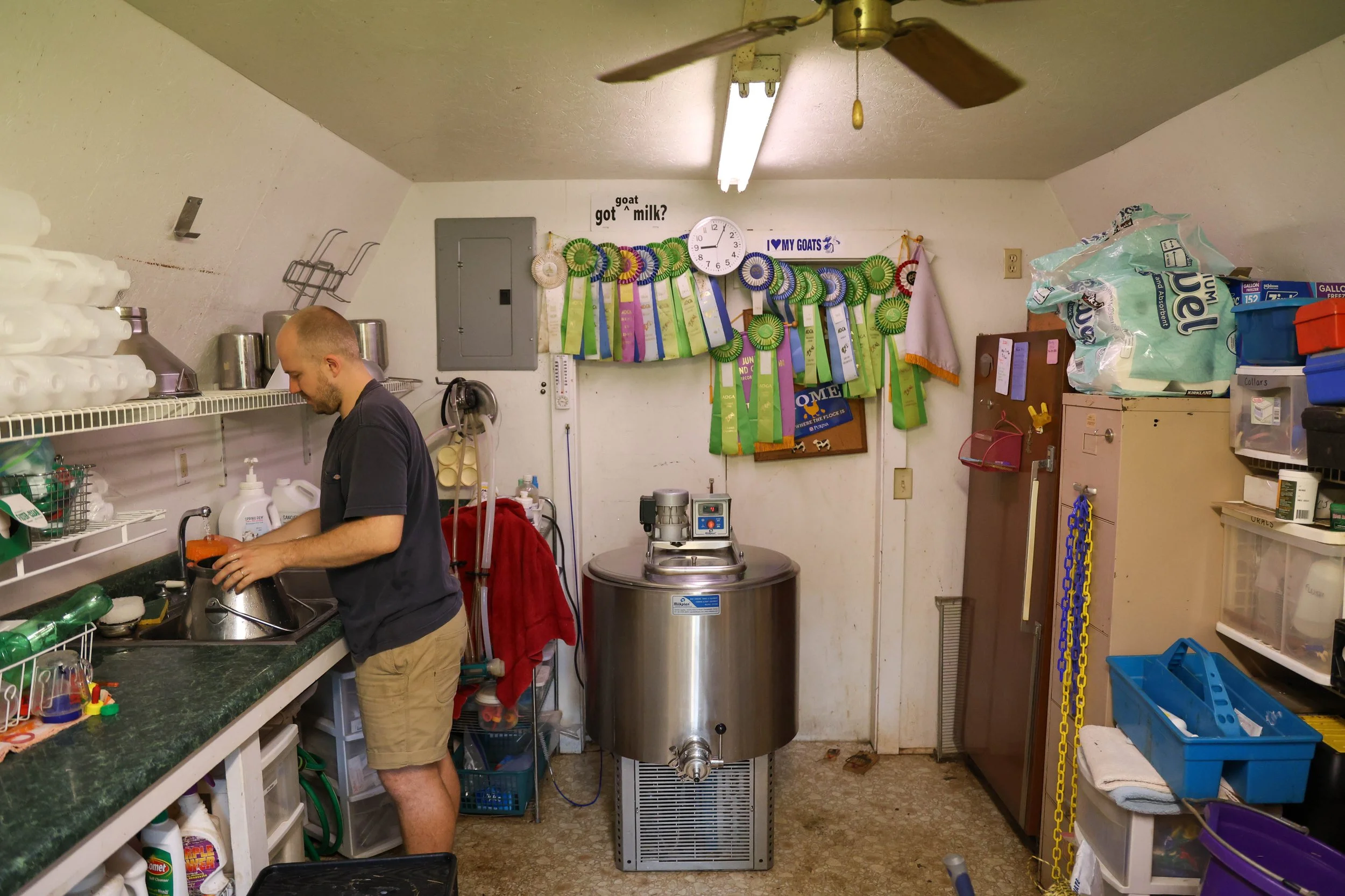 Matthew Terry, manager of Leaping Goat Soap, 32, from Thetford, England, pours milk into the milk bulk tank at Latimer Luck Acres in Watkinsville, Georgia, on Saturday, May 25, 2024. The tank was shipped in from Greece, where it holds over 30 gallons of milk and chills it quickly to help ensure a safe temp.