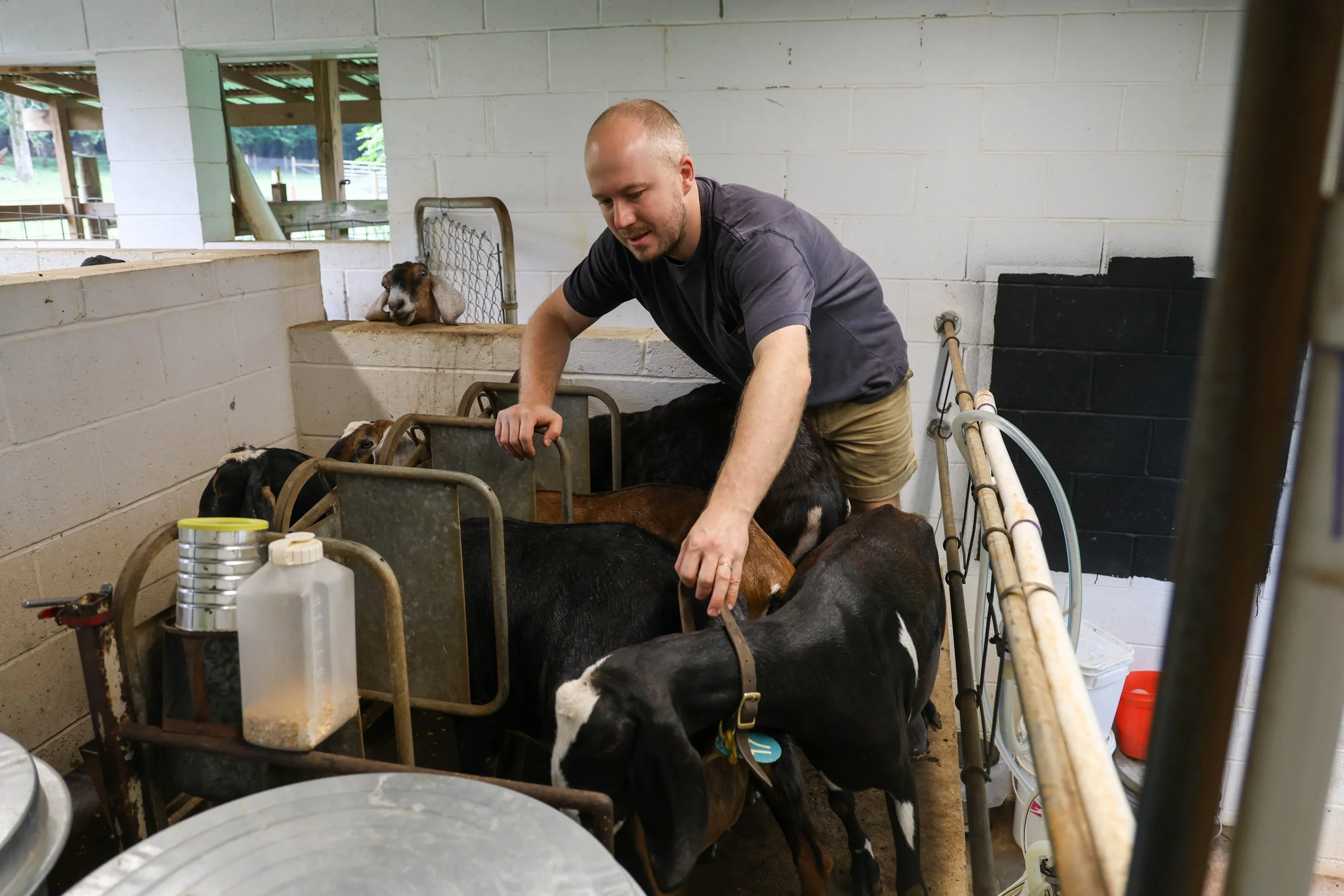 Matthew Terry, manager of Leaping Goat Soap, 32, from Thetford, England, prepares to milks the goat at Latimer Luck Acres in Watkinsville, Georgia, on Saturday, May 25, 2024. Terry currently milks 13 goats two times a day.
