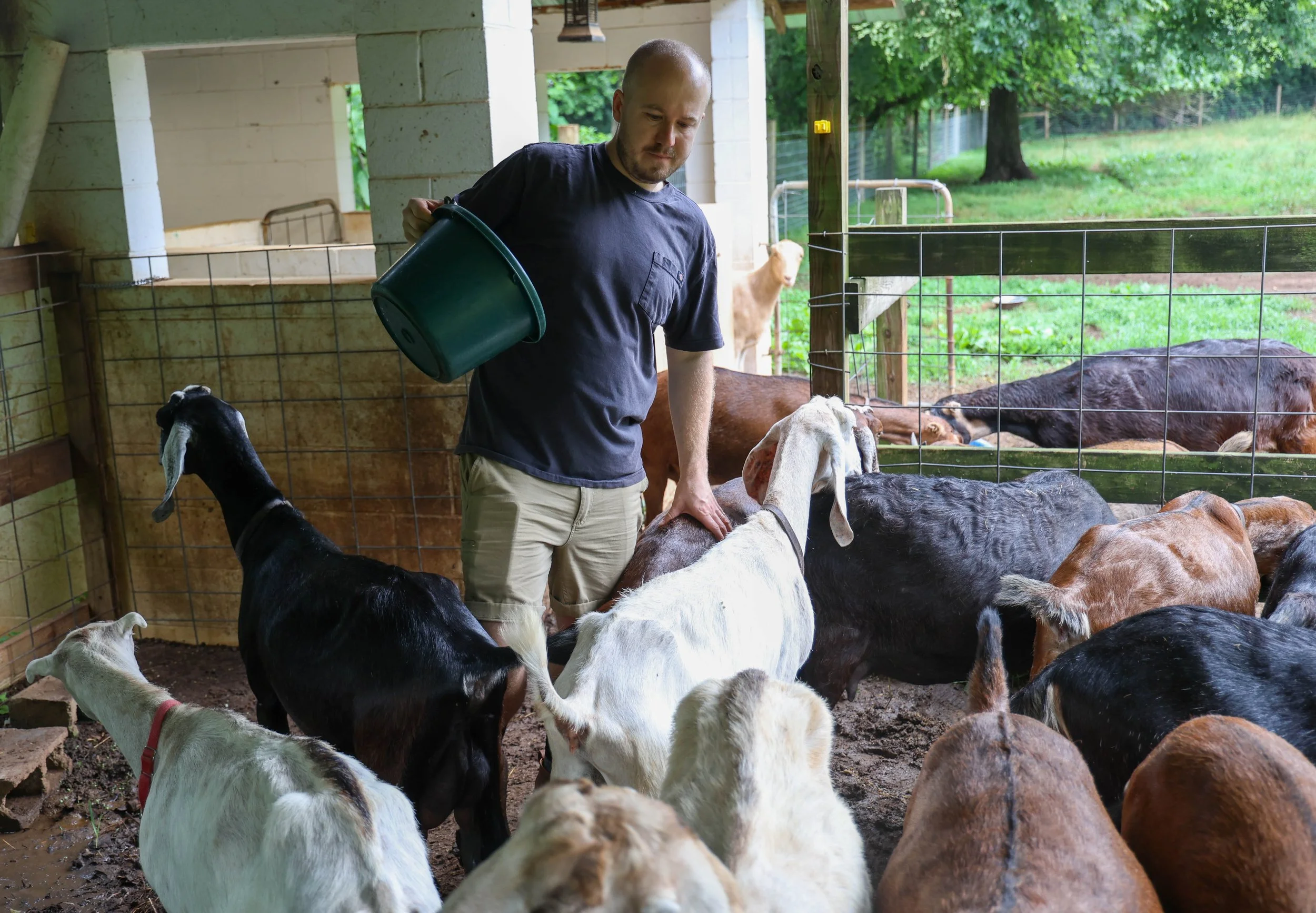 Matthew Terry, manager of Leaping Goat Soap, 32, from Thetford, England, feeds the goats at Latimer Luck Acres in Watkinsville, Georgia, on Saturday, May 25, 2024. The farm has around 50 goats, but Terry plans to send some to the Zoo Atlanta.