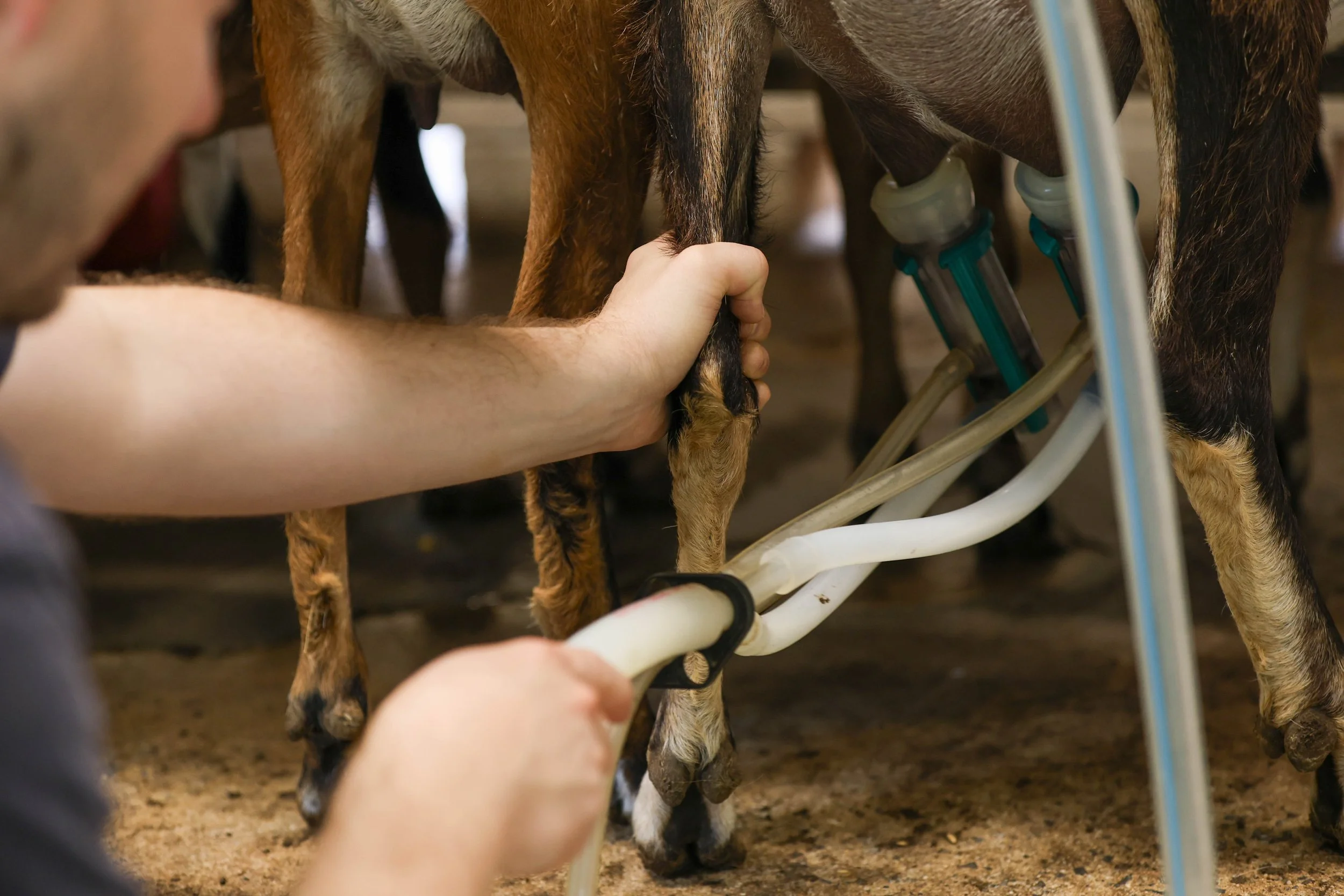 Matthew Terry, manager of Leaping Goat Soap, 32, from Thetford, England, milks the goat at Latimer Luck Acres in Watkinsville, Georgia, on Saturday, May 25, 2024. Terry currently milks 13 goats two times a day.